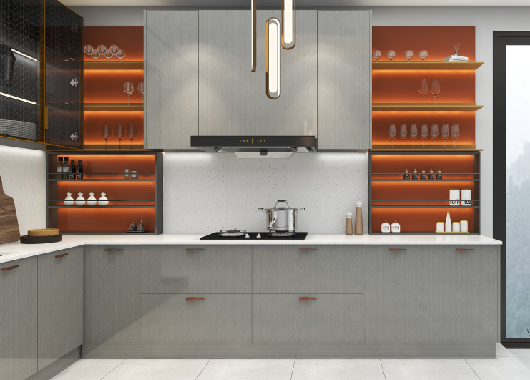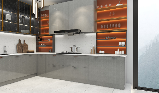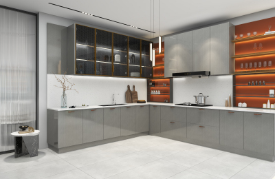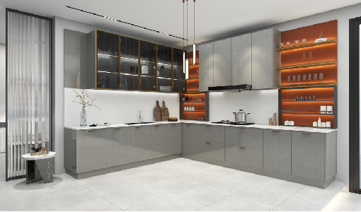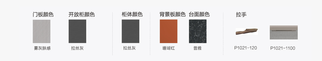 霧灰膚感與珊瑚紅撞色搭配,體現(xiàn)出一種不事張揚的內(nèi)在美。菱紋白橡與珊瑚紅的線條,讓整個廚房簡潔柔美。恰到好處的燈光設計,讓生活更多浪漫。