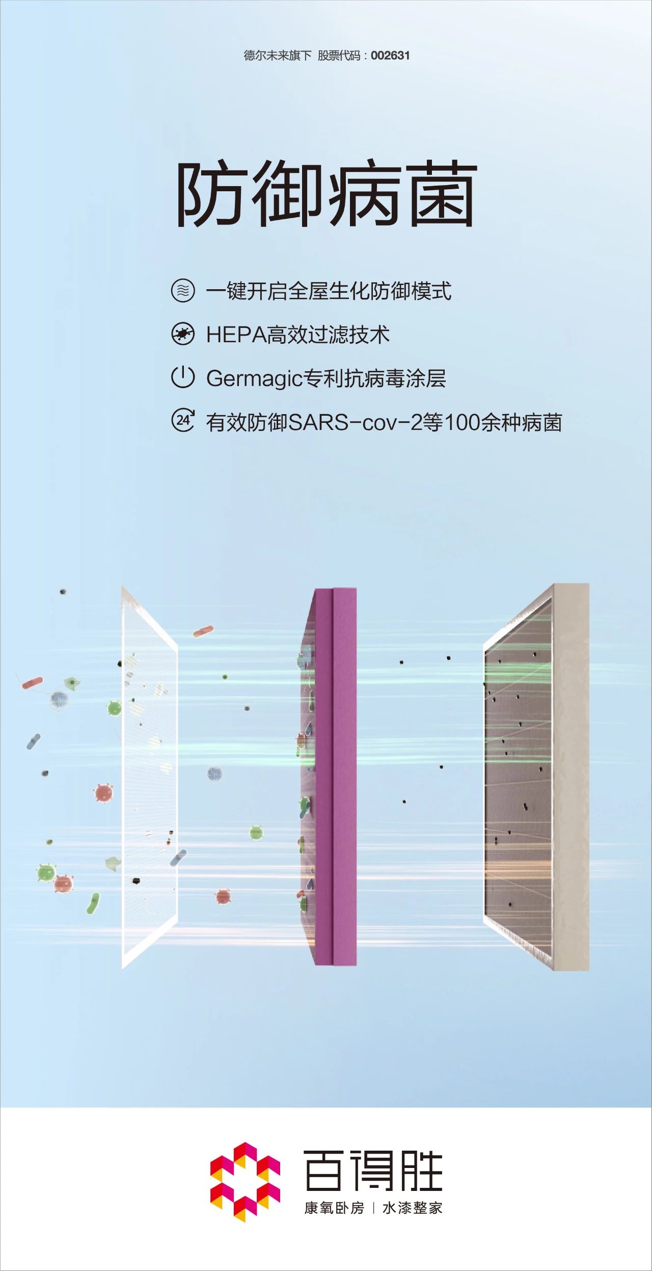 百得勝水漆新風(fēng)門,凈化濾網(wǎng)采用了2018年日內(nèi)瓦國際發(fā)明展金獎Germagic緩釋長效除病菌專利技術(shù),結(jié)合HEPA13級濾網(wǎng),能夠有效防御SARS-cov-2等100余種病菌,一鍵即可開啟全屋除病菌模式,守護(hù)家人的健康呼吸。