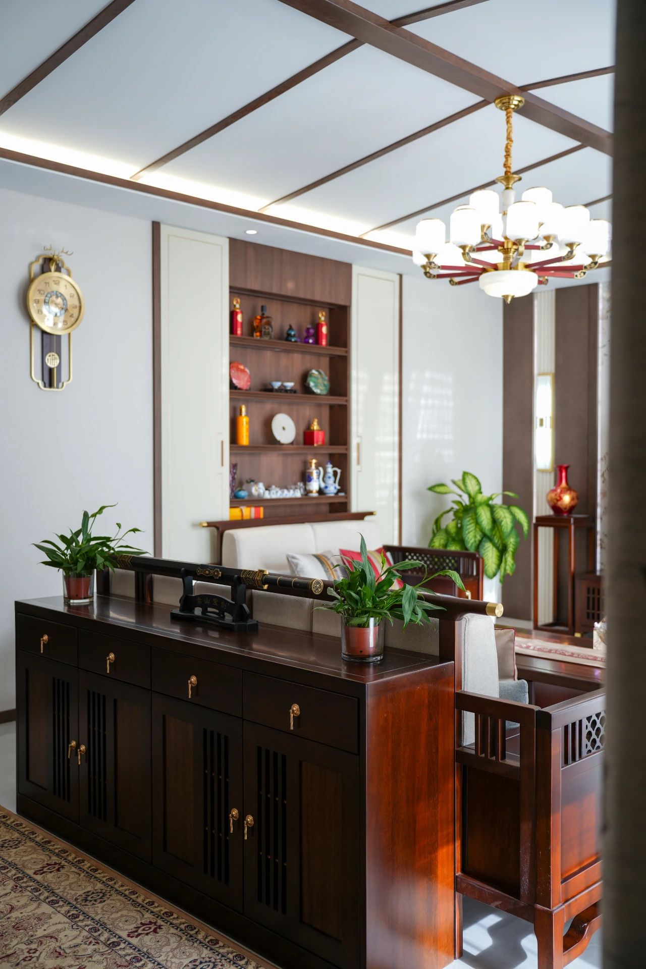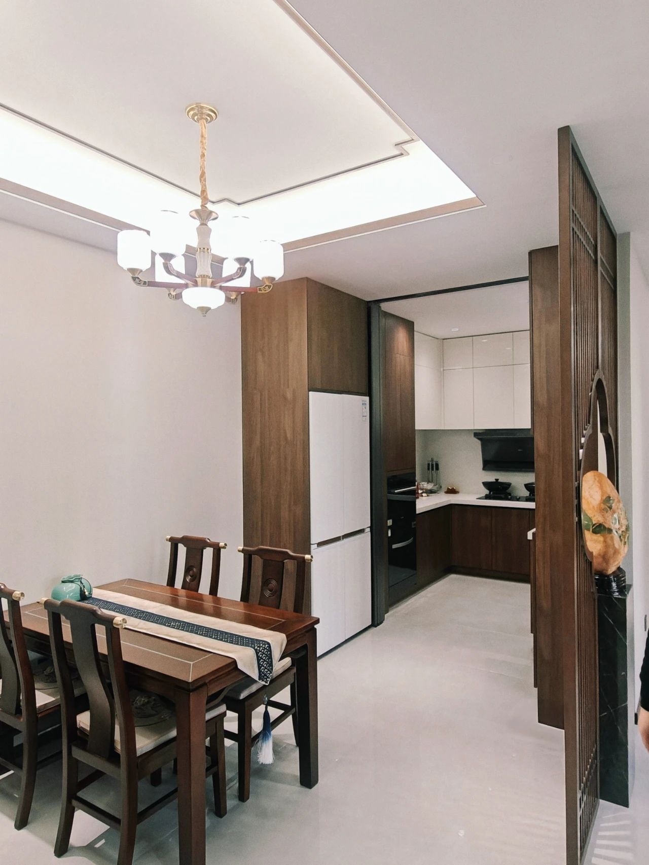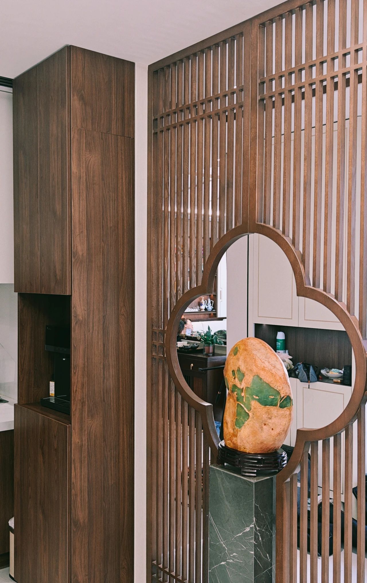 設(shè)計(jì)師以客戶需求為原點(diǎn),擴(kuò)容衣帽間、嵌入式酒柜設(shè)計(jì),兼顧實(shí)用與詩(shī)意。從設(shè)計(jì)到安裝全程透明溝通,建立專屬服務(wù)群,48小時(shí)響應(yīng)維護(hù),終身守護(hù)家的品質(zhì),讓家,成為心安的歸處。客餐廚:東方意蘊(yùn)的現(xiàn)代表達(dá)開(kāi)放式客餐廚空間以胡桃木色為主調(diào),木格柵虛實(shí)交錯(cuò),天然木皮飾面的護(hù)墻板與柜體形成視覺(jué)延展,搭配淺灰色布藝家具,空間疏朗卻不失溫度。墻面留白處點(diǎn)綴水墨畫元素,燈具選用啞光銅質(zhì)吊燈,光影流轉(zhuǎn)間,盡顯新中式的含蓄與張力。客廳間,胡桃木紋理與綠意呼應(yīng),營(yíng)造“禪茶一味”的冥想空間,業(yè)主稱此處亦是“心靈的自留地”。在這片餐廚空間中,交融互通,通透敞亮,自然的木紋與格柵線條相互映襯,光影流轉(zhuǎn),仿佛在訴說(shuō)著古今交融的人間煙火。房主好酒,設(shè)計(jì)師巧妙利用一樓客廳原本靠窗位置,打造嵌入式酒柜。水漆木紋柜體與玻璃層板相映,既滿足藏酒展示需求,又借對(duì)面落地窗自然光線為空間增添靈動(dòng)感。酒柜線條簡(jiǎn)潔,木色溫潤(rùn),成為客廳的一處點(diǎn)睛之筆。