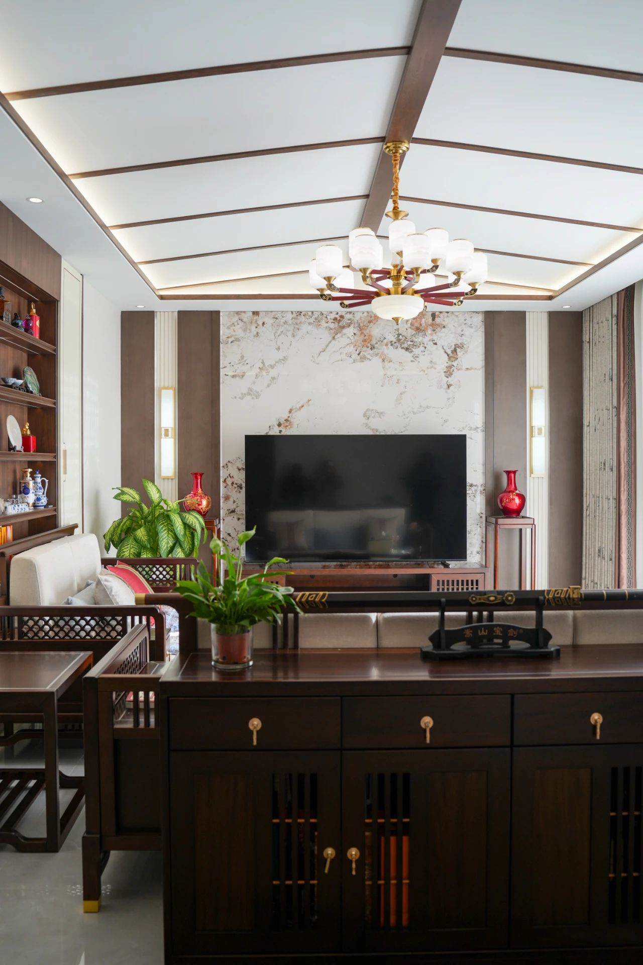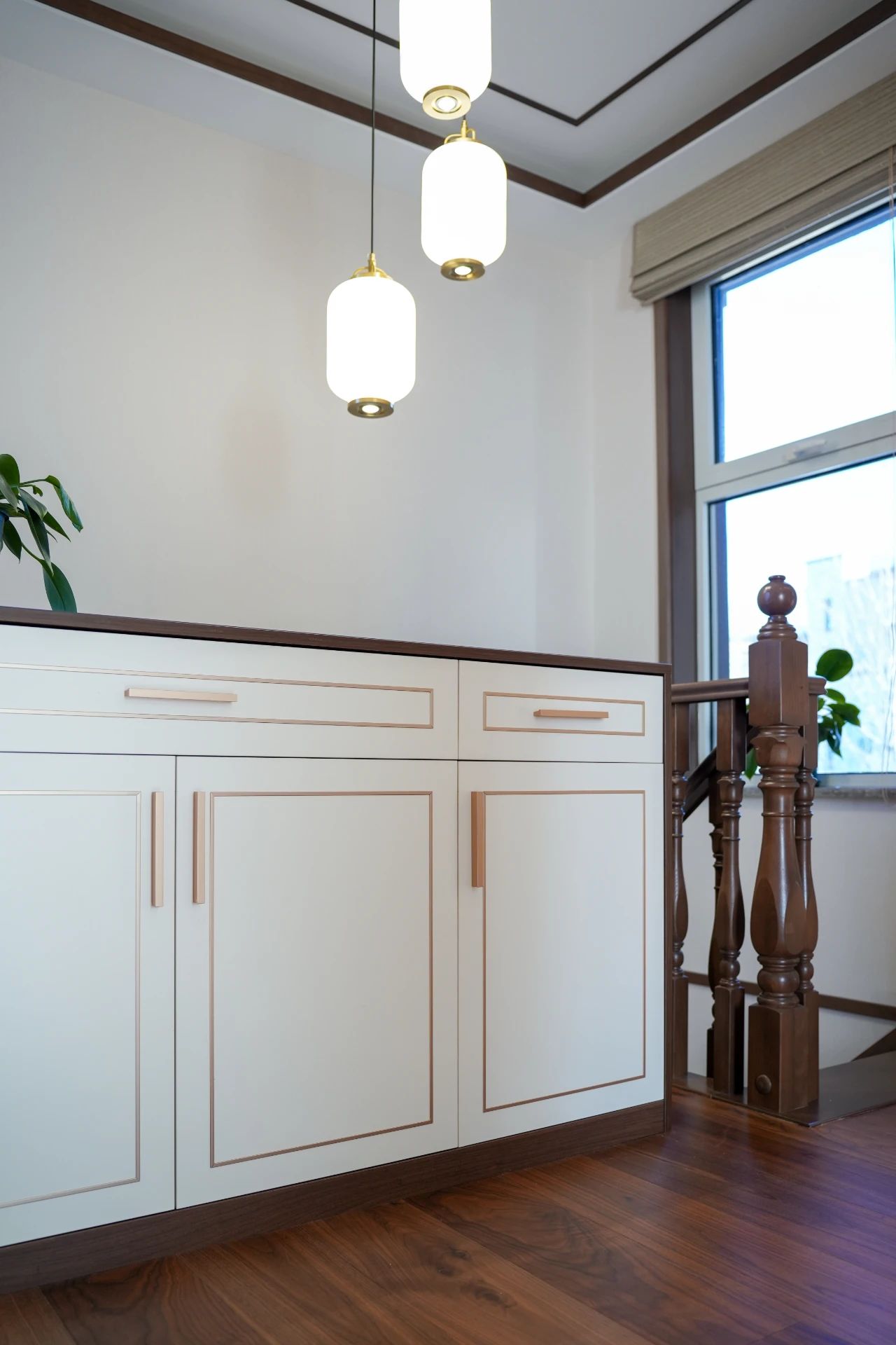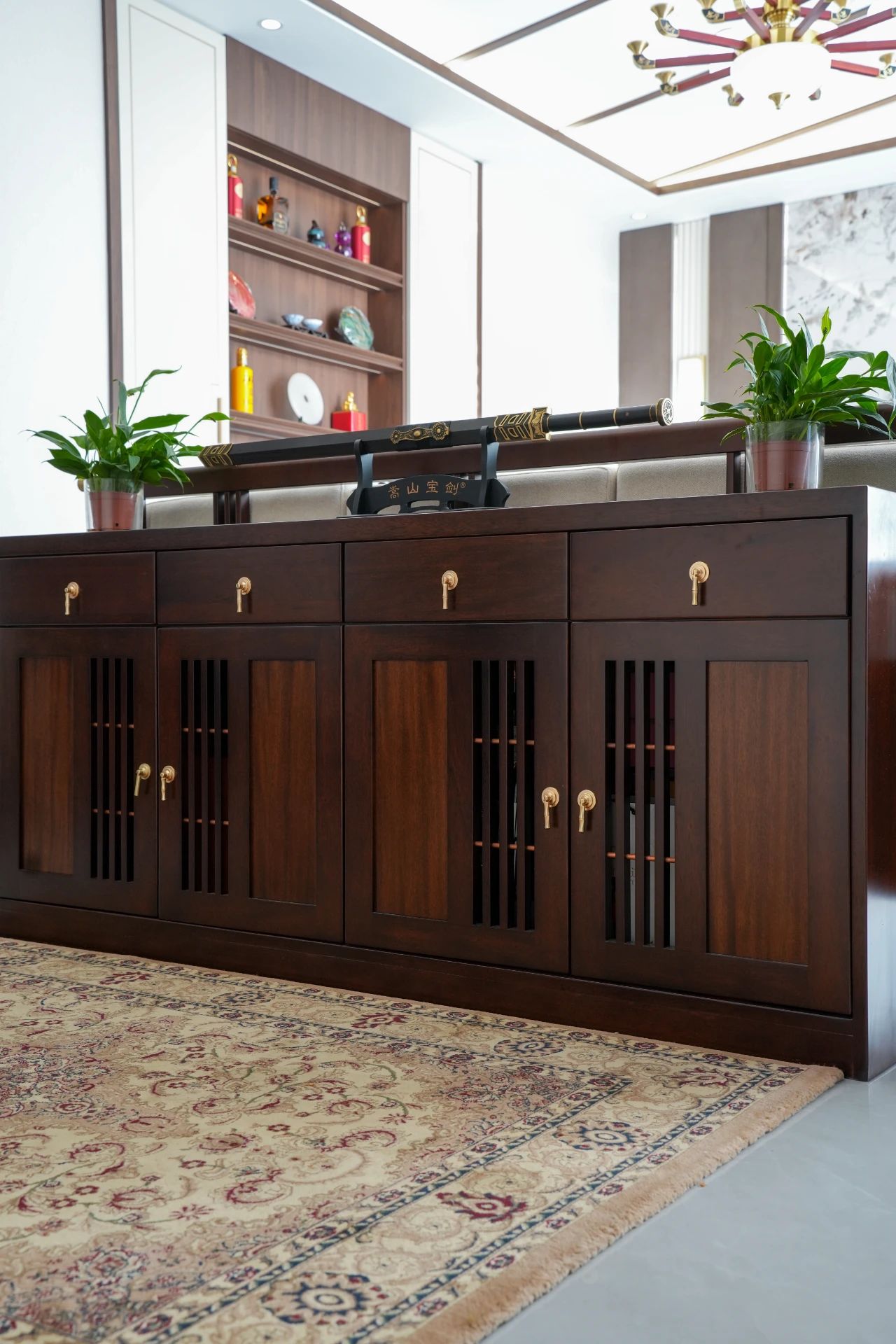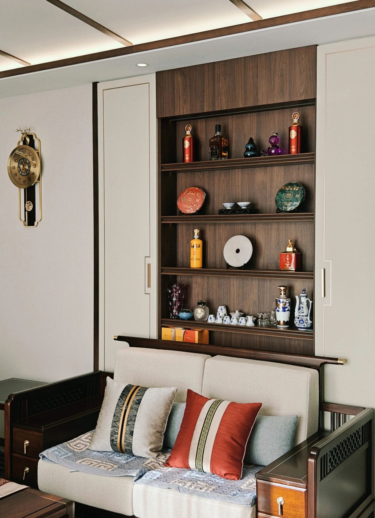設(shè)計(jì)師以客戶需求為原點(diǎn),擴(kuò)容衣帽間、嵌入式酒柜設(shè)計(jì),兼顧實(shí)用與詩(shī)意。從設(shè)計(jì)到安裝全程透明溝通,建立專屬服務(wù)群,48小時(shí)響應(yīng)維護(hù),終身守護(hù)家的品質(zhì),讓家,成為心安的歸處。客餐廚:東方意蘊(yùn)的現(xiàn)代表達(dá)開(kāi)放式客餐廚空間以胡桃木色為主調(diào),木格柵虛實(shí)交錯(cuò),天然木皮飾面的護(hù)墻板與柜體形成視覺(jué)延展,搭配淺灰色布藝家具,空間疏朗卻不失溫度。墻面留白處點(diǎn)綴水墨畫元素,燈具選用啞光銅質(zhì)吊燈,光影流轉(zhuǎn)間,盡顯新中式的含蓄與張力。客廳間,胡桃木紋理與綠意呼應(yīng),營(yíng)造“禪茶一味”的冥想空間,業(yè)主稱此處亦是“心靈的自留地”。在這片餐廚空間中,交融互通,通透敞亮,自然的木紋與格柵線條相互映襯,光影流轉(zhuǎn),仿佛在訴說(shuō)著古今交融的人間煙火。房主好酒,設(shè)計(jì)師巧妙利用一樓客廳原本靠窗位置,打造嵌入式酒柜。水漆木紋柜體與玻璃層板相映,既滿足藏酒展示需求,又借對(duì)面落地窗自然光線為空間增添靈動(dòng)感。酒柜線條簡(jiǎn)潔,木色溫潤(rùn),成為客廳的一處點(diǎn)睛之筆。