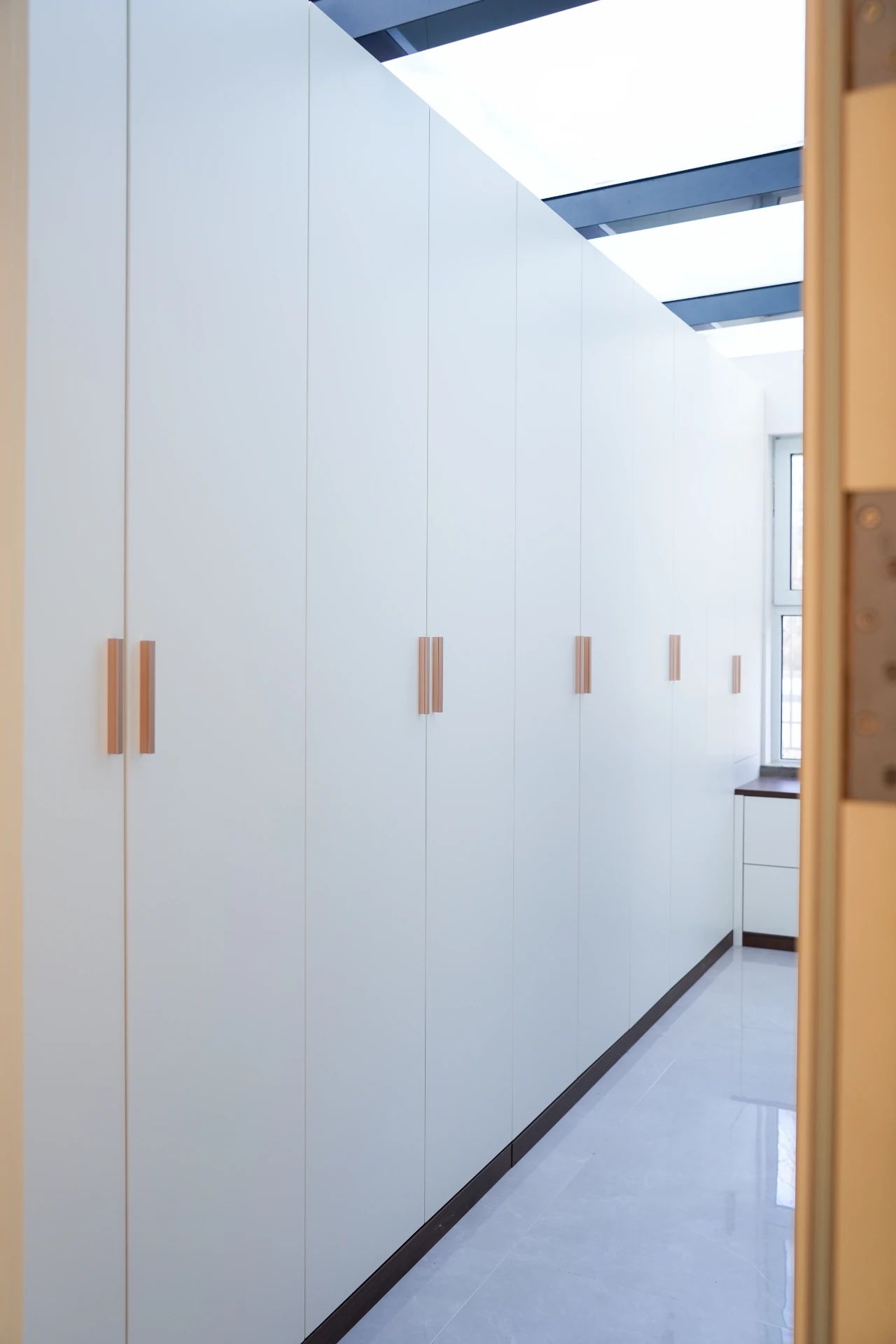 原戶型衣帽間位置局促,設(shè)計(jì)師突破常規(guī),在一樓外拓區(qū)域搭建玻璃頂衣帽間。通頂木紋柜體搭配金屬拉手,簡(jiǎn)約大氣;頂部玻璃引入天光,讓衣物收納區(qū)成為光影交織的藝術(shù)空間。功能與美學(xué)在此完美統(tǒng)一,業(yè)主贊其為“最驚喜的設(shè)計(jì)”。