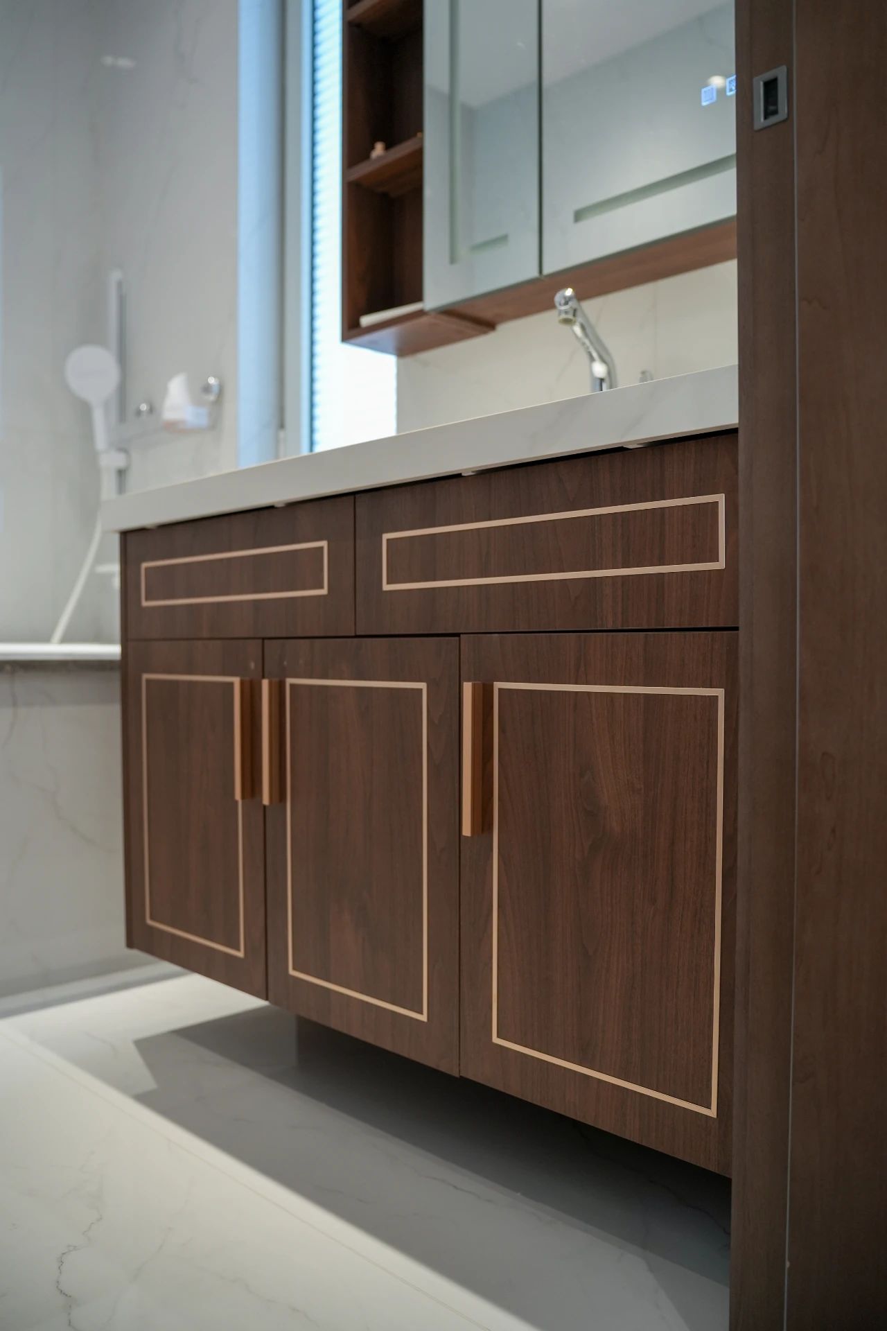 本案是一套260㎡新中式別墅,以簡(jiǎn)馭繁,融合東方禪意與現(xiàn)代美學(xué)。甄選百得勝水漆天然木皮,木紋肌理自然靈動(dòng),漆面飽滿如玉。暖灰與胡桃木色交織,門、墻、柜渾然一體,營(yíng)造靜謐雅致的氛圍。