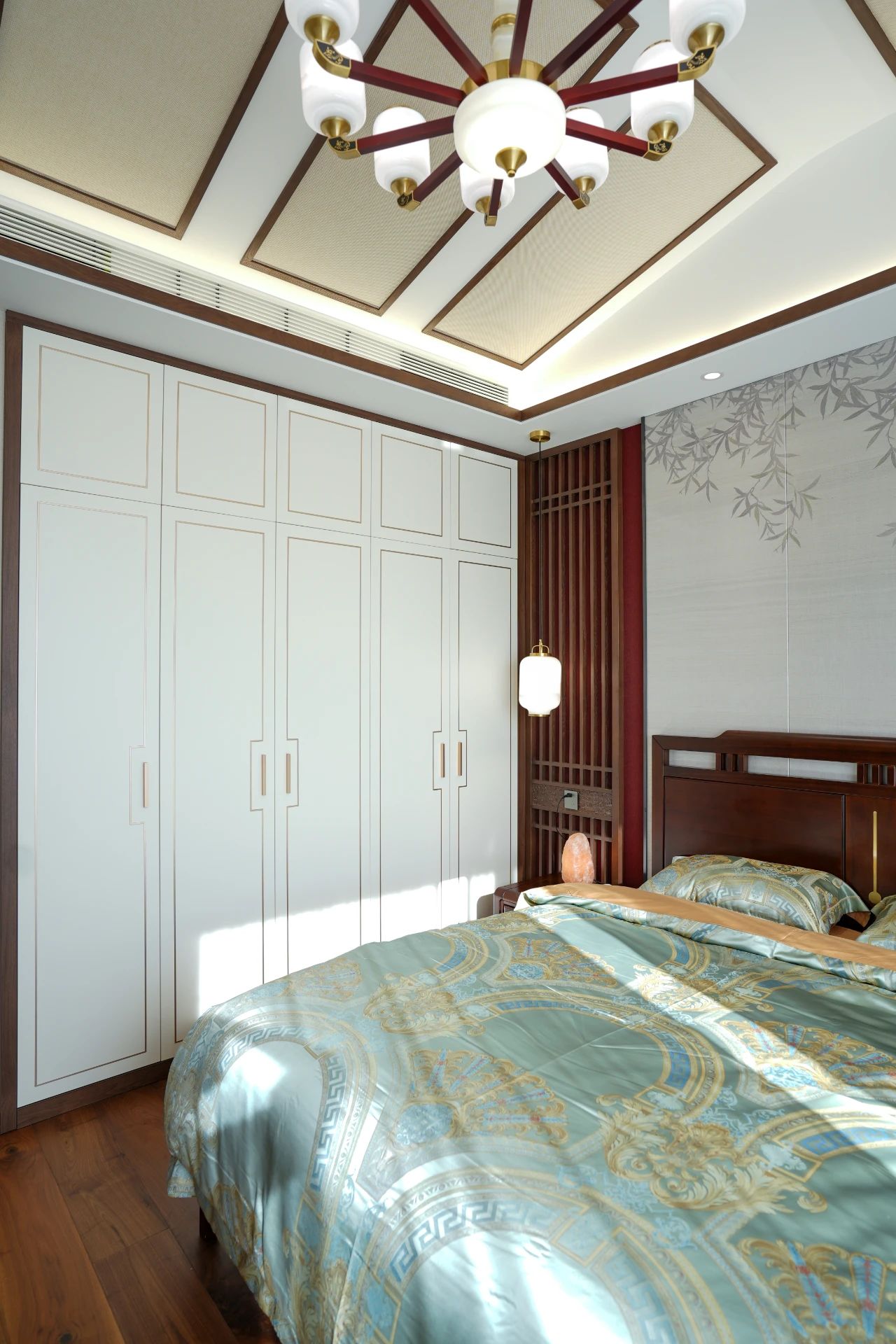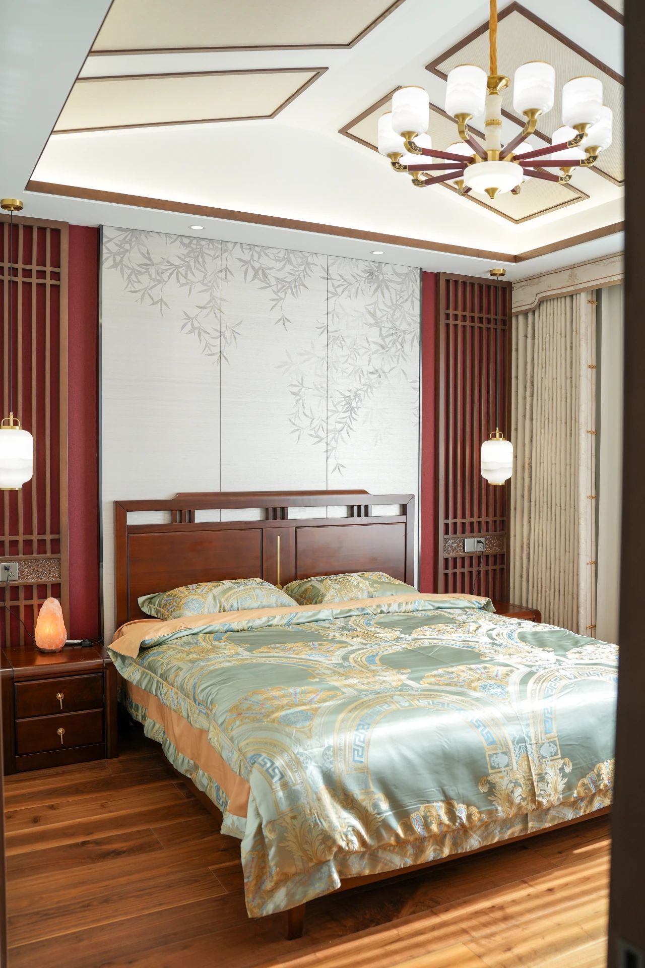 主臥延續(xù)暖灰與木色基調(diào),床頭背景墻以天然木皮拼接幾何線條,簡(jiǎn)約中透出層次感。定制衣柜采用隱形拉手設(shè)計(jì),與墻面無(wú)縫銜接,視覺(jué)更顯開(kāi)闊。飄窗增設(shè)軟墊與小幾,成為房主品茶觀景的私密角落。